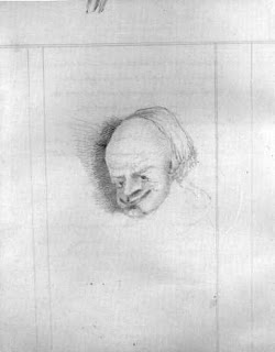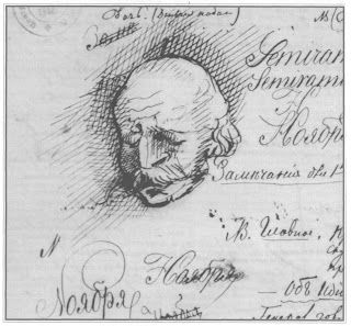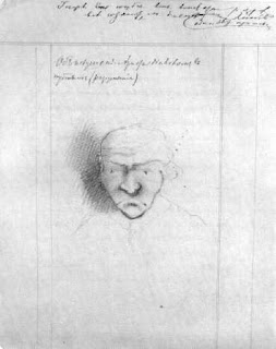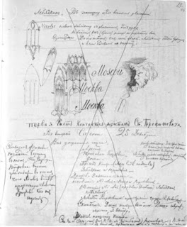 A seguir, desenho de Dostoievski feito no caderno de !"O Idiota" (anotações da primeira redação da obra, em 1867), representando o príncipe Michkin:
