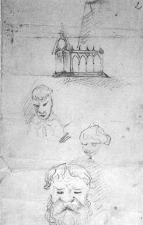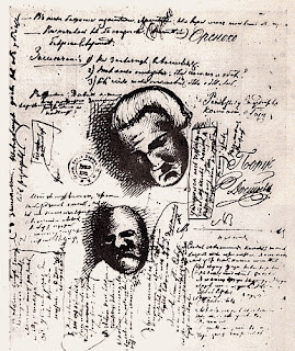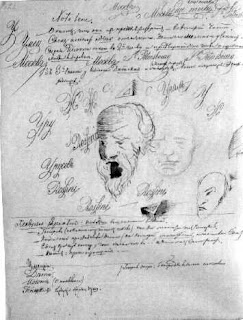 Não poderia faltar um auto retrato: ele está a seguir; confesso que não consegui enxergar nada semelhante ao famoso escritor no esboço abaixo. Pode ser pela qualidade da reprodução ou pelo tamanho da foto, não sei. Quem sabe se você, leitor, o localiza? Trata-se de um auto-retrato de Dostoievski na juventude, entre 18-20 anos, ao lado da figura levemente exagerada de um velho, que representa Rossini, o compositor italiano, que faleceu no ano deste desenho (1868), em Florença, Itália.