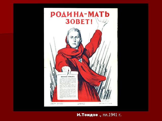 A seguir, vê-se um cartaz da época da guerra. A mulher de vermelho representa a Pátria. Nas mãos, ela carrega um juramento de guerra. O cartaz diz: "A Pátria mãe chama".